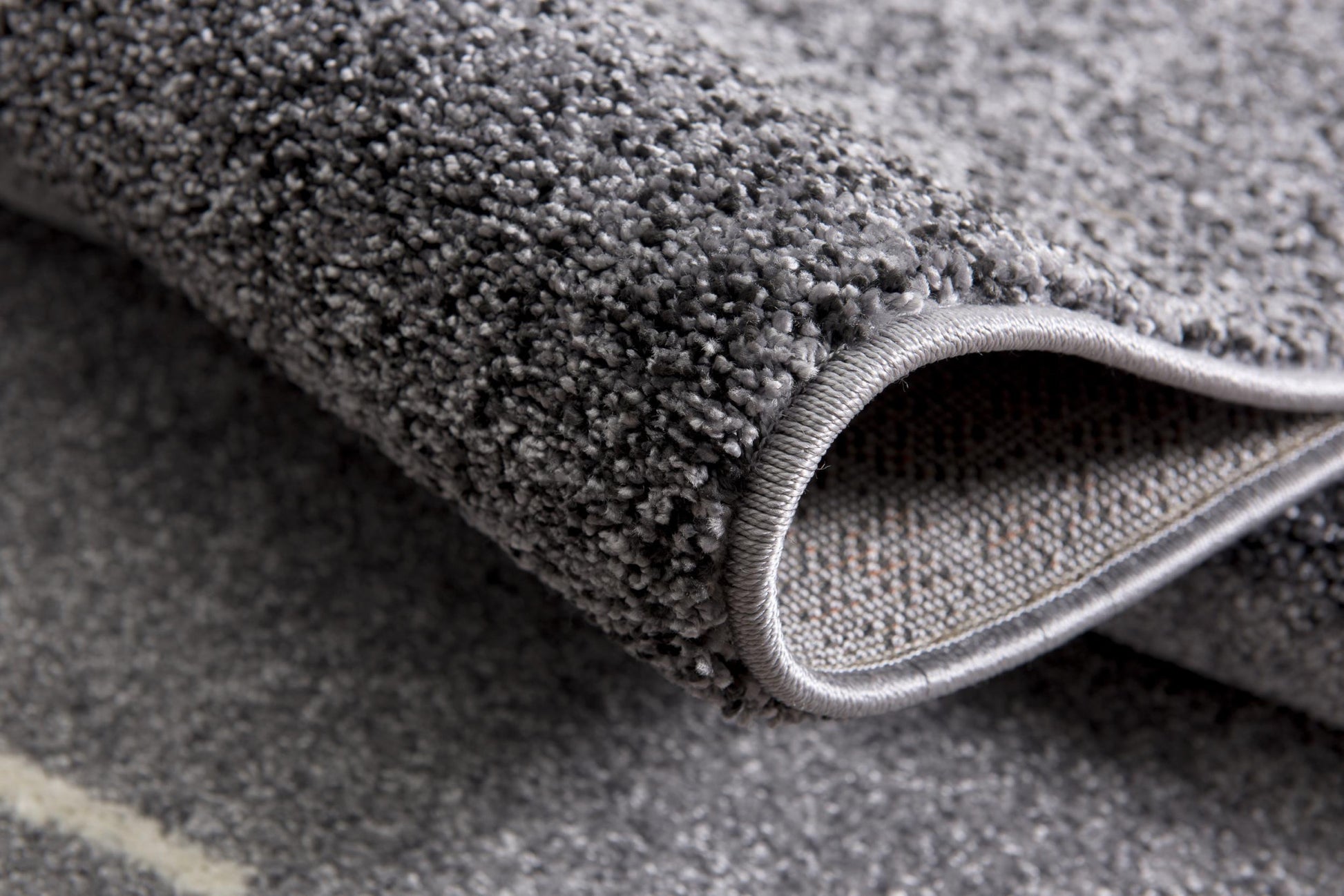 Upholding a clean look in a stylish palette, this Gray Modern Geometric Area Rug will create a harmonizing balance with a fresh touch to your modern living space. Divided into asymmetrical blocks of gray, ivory, and charcoal black in a distressed fashion with fine lines as accents to create visual appeal. Skilfully crafted in Turkey with 100% twisted polypropylene making the rug more durable and resistant to fading and staining. The high pile construction adds to the surface interest for a soft and smooth underfoot which is ideal for indoor areas with children and pets. Capturing the art of sophistication in its neutral hues, this area rug is bound to blend in with the aesthetics of your modern home. 126” x 93” x 0.8”